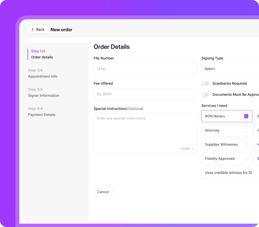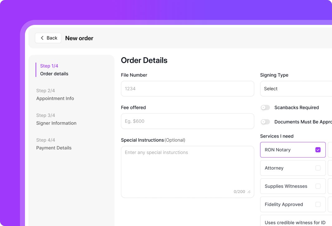 Easily place an order, select a qualified notary of your choosing, and recieve completed documents - all in one streamlined platform